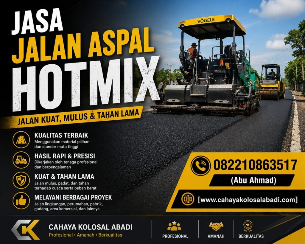 Kami telah mengerjakan berbagai projek untuk aspal jalan / hotmix jalan, dengan banyak projek yang telah kami kerjakan membuat tingkat kepercayaan konsumen meningkat terhadap kami, Ayo Konsultasikan pengerjaan anda bersama kami.