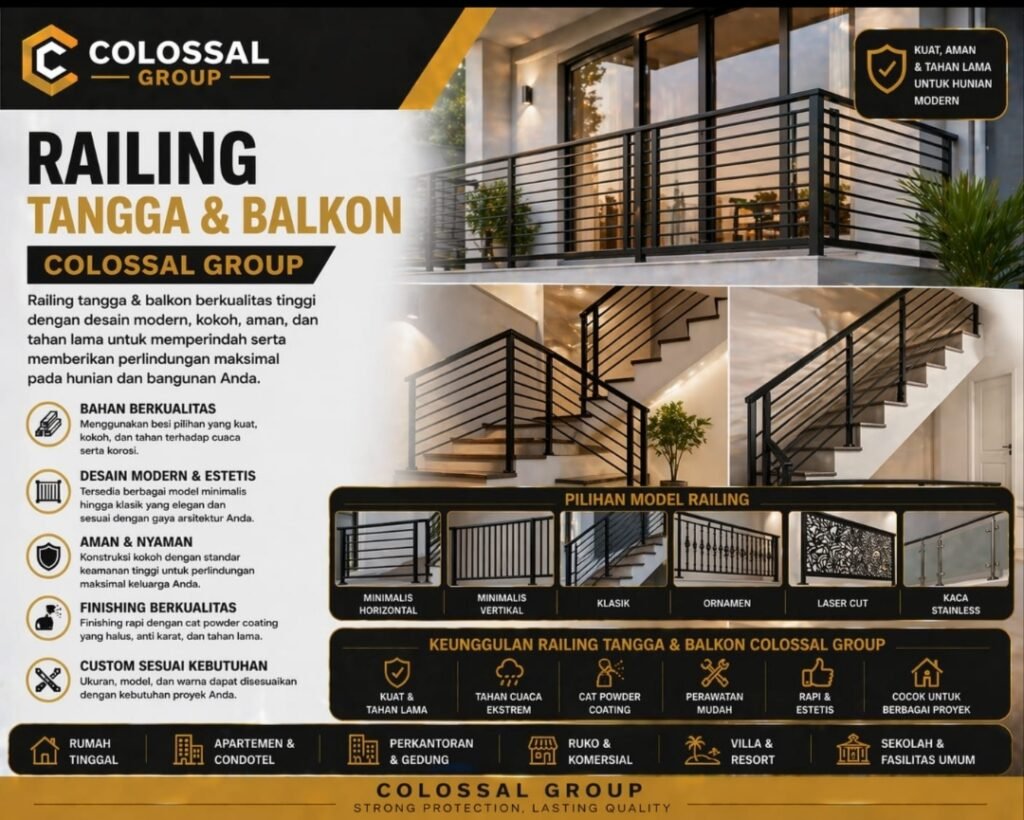 Bengkel las Colossal Steel merupakan divisi khusus yang fokus sebagai penyedia jasa pembuatan Railing Tangga Dan Balkon dari PT Cahaya Kolosal Abadi yang merupakan sebuah perusahaan Kontraktor Steel yang bergerak dibidang Jasa Aplikator Las. Colossal Steel adalah pilihan tepat sebagai partner Anda yang siap menyediakan Jasa Bengkel las untuk mewujudkan suasana baru baik rumah pribadi atau kantor anda.  Sebagai penyedia jasa bengkel las yang berlokasi di tengah tengah jawa barat & Jabodetabek yang siap menjangkau konsumen  di area Jawa Barat, jabodetabek dan sekitarnya. PT Cahaya Kolosal Abadi adalah pilihan tepat sebagai partner Anda yang siap menyediakan jasa bengkel las untuk mewujudkan suasana baru baik rumah pribadi atau kantor anda.  Sebagai jasa pembuatan railing tangga dan balkon di Jabodetabek yang menjangkau konsumen sampai berbagai area sekitarnya tanpa terkecuali.