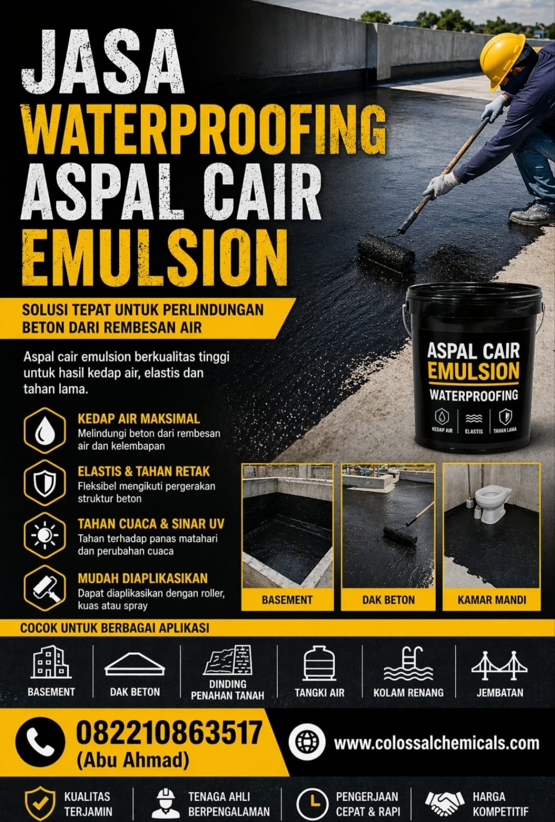 Jangan khawatir tentang harga Waterproofing Aspal Cair Emulsion , karena kami menawarkan kualitas kerja yang terjamin. untuk informasi lebih lanjut, hubungi manajemen Perusahaan khususnya bagian Marketing.